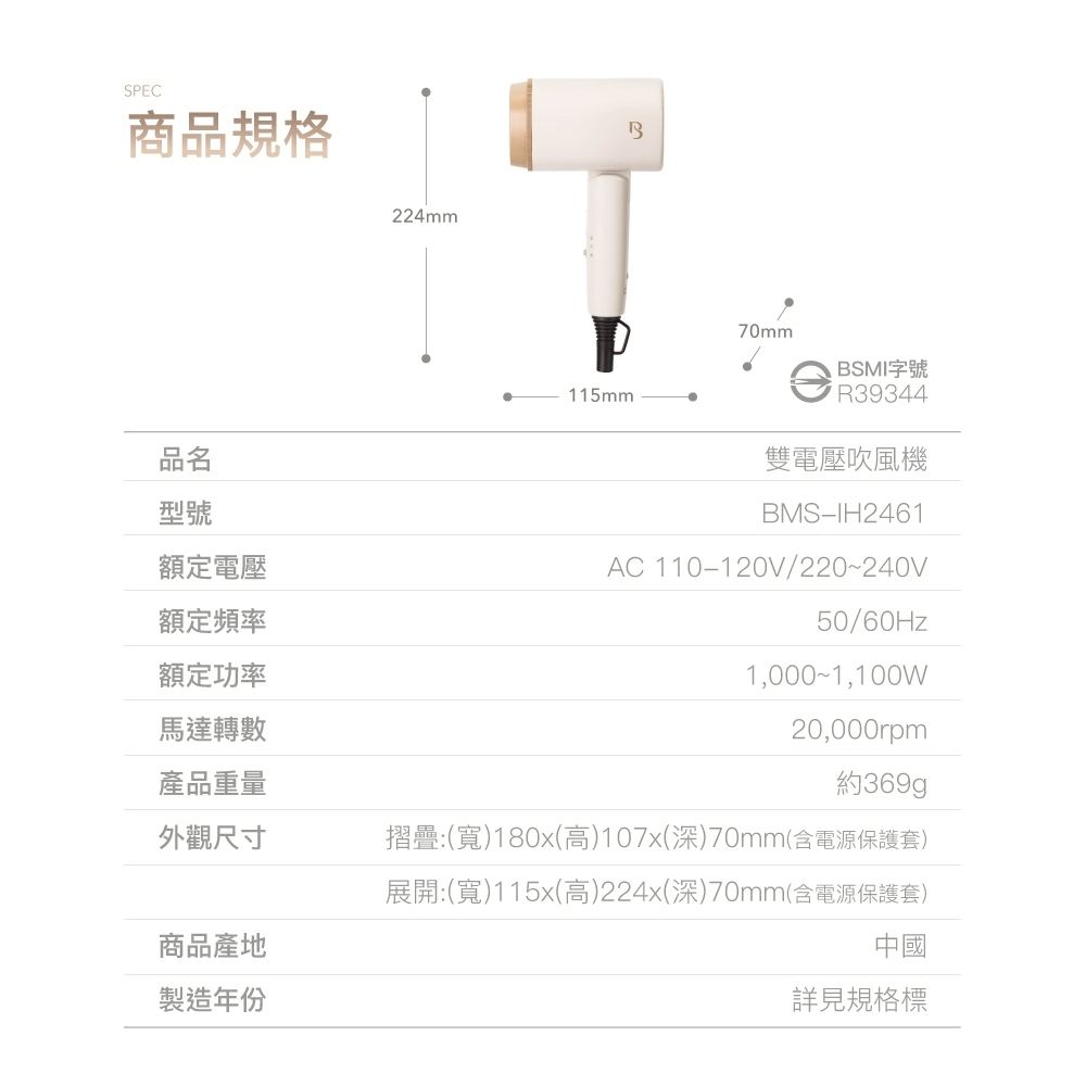 【德國巴慕斯 BAMOUSSE】雙電壓輕量摺疊吹風機 BMSIH-2461