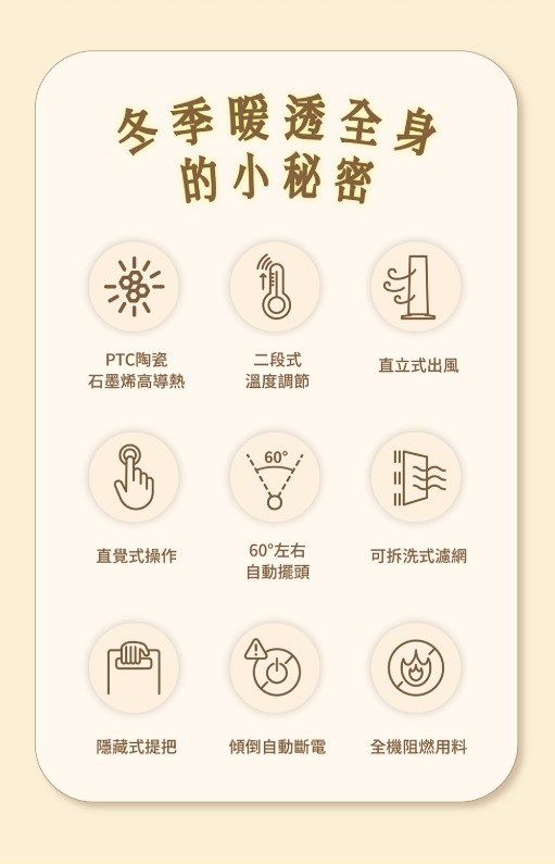 採用 高導熱石墨烯 + PTC陶瓷發熱技術,升溫迅速、恆溫穩定、送暖廣角不乾燥,寒流來襲也不怕🔥