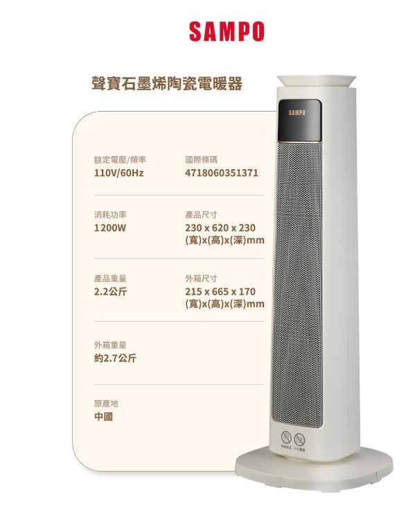 【SAMPO 聲寶】石墨烯陶瓷電暖器 HX-LM12P